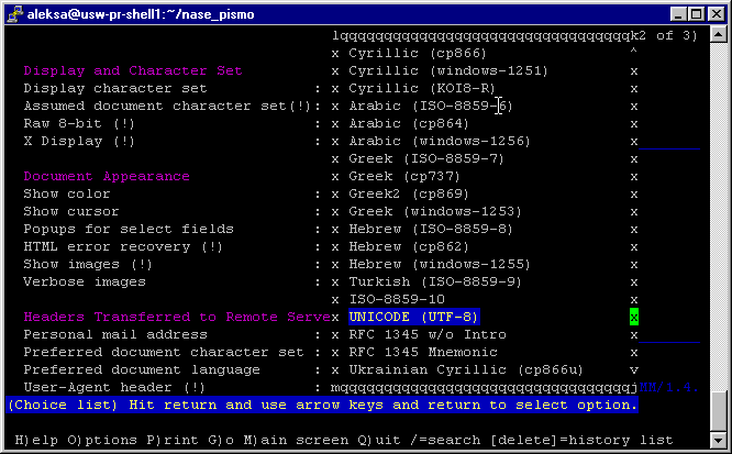 Уколико ваше текстуално окружење користи УТФ-8 или други кодни распоред који може да приказује ћирилицу, можете подесити Lynx да приказује ћирилицу без транскрипције. Да бисте то урадили, притисните o (options) и у трећој групи опција ("Display and Character Set") изаберите мени "Display character set" (притиском на ентер). Затим у менију (стрелицама горе - доле) изаберите кодни распоред који ваше текстуално окружење користи (УТФ-8 налази се при дну а ћирилице нешто изнад, погледајте слику доле). Затим још идете на врх странице са опцијама, обележите кућицу поред "Save options to disk:" (притиском на ентер) и на исти начин "кликнете" на "Accept Changes".
